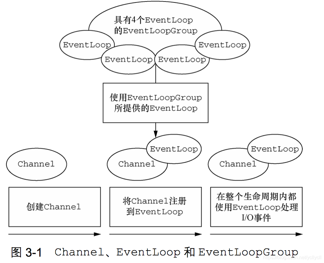 EventLoop 定义了 Netty 的核心抽象,用于处理连接的生命周期中发生的事件。下图说明了 Channel、EventLoop 和 EventLoopGroup 的关系: