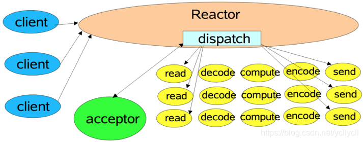 Netty中的Reactor模型主要由多路复用器(Acceptor)、事件分发器(Dispatcher)、事件处理器(Handler)组成。