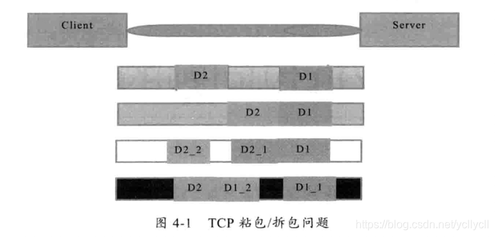 (3) 服务端分两次读取到了两个数据包,第一次读取到了完整的D1包和D2包的部分内容,第二次读取到了D2包的剩余内容,这被称为TCP拆包;