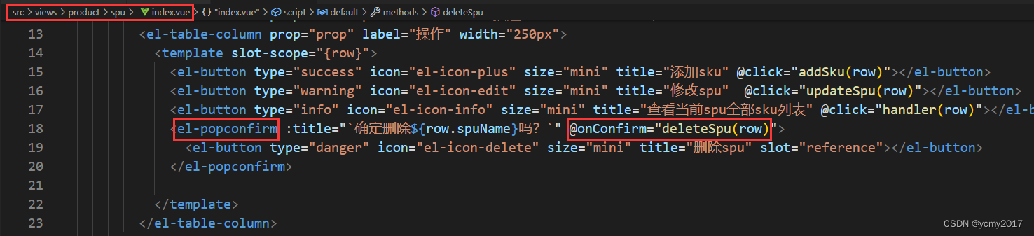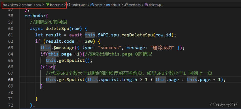 先做spu列表页面的删除spu功能,当用户点击列表页面的删除按钮时,我们需要提示用户,并且想服务器发送请求,删除对应的spu记录。删除记录后,需要重新获取数据;但是如果是