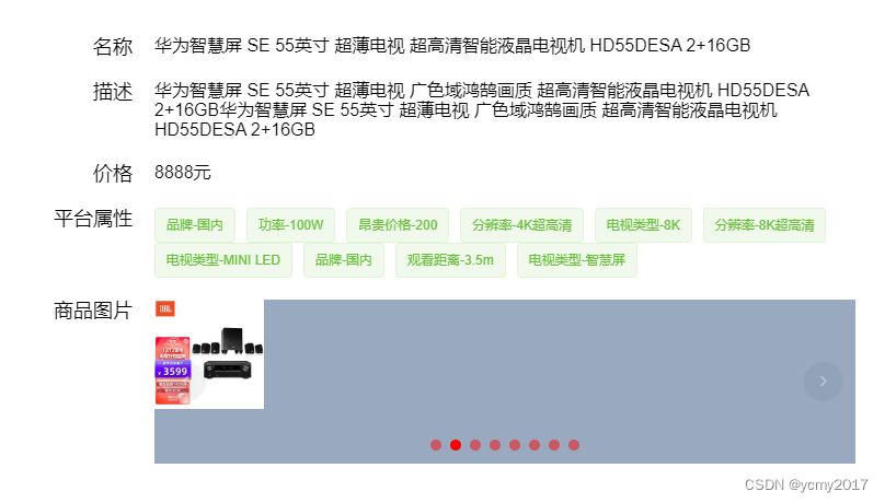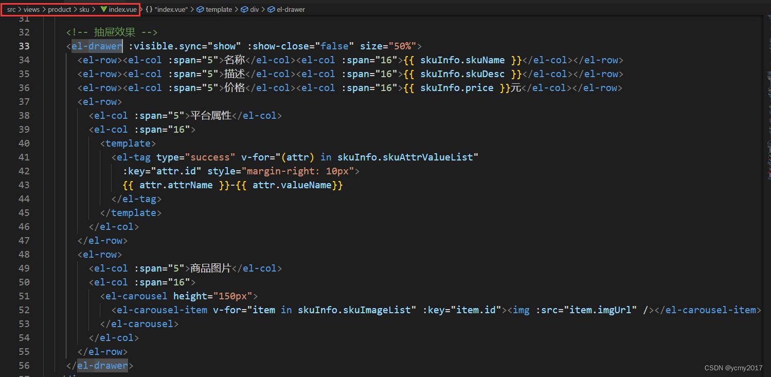 当用户点击列表的查看详情按钮的时候,我们需要从右向左实现抽屉效果,需要请求服务器获取数据;实现抽屉效果需要用到el-drawer组件。商品图片还需使用轮播图效果el-carousel;