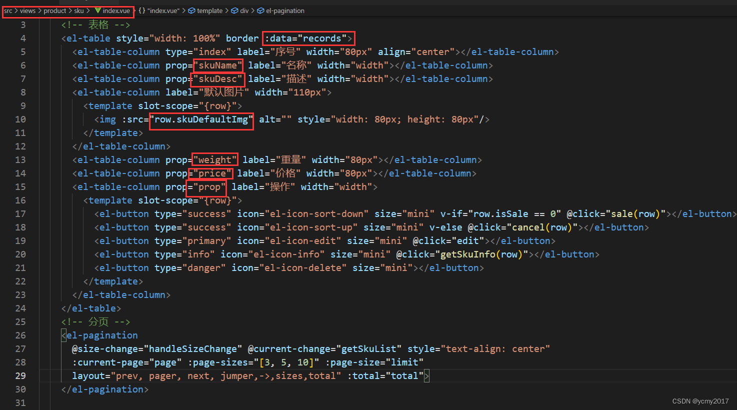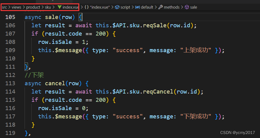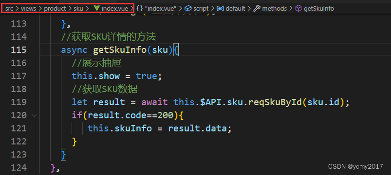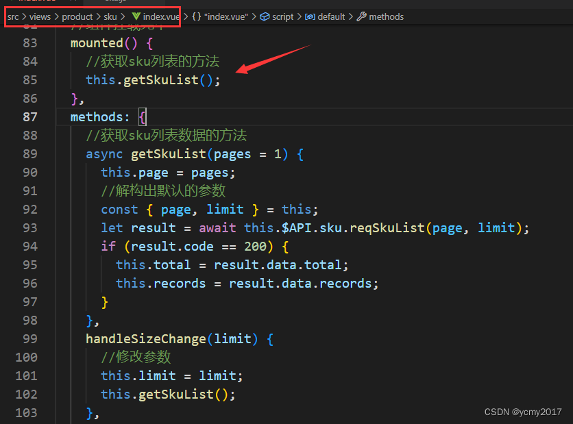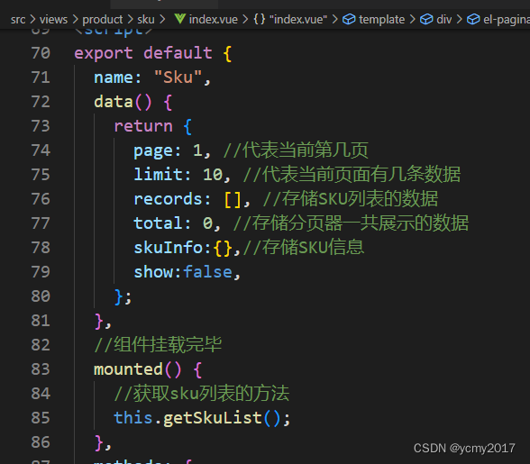 当用户点击Sku管理,组件挂载的时候,我们需要获取sku列表信息;但是获取列表方法在分页列表改变页码和每页显示大小的时候也需要触发,我们封装为一个方法。