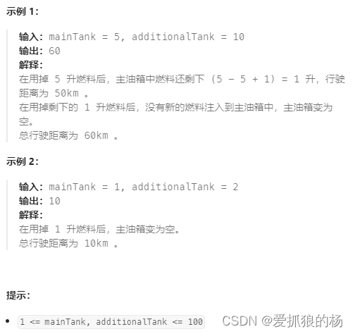 模拟一下即可,每次让 mainTank 减去 5 ,然后如果 additionalTank 大于 0,就在让 mainTank 加 1,最后让 additionalTank 减 1。当不满足 mainTank - 5 >= 0 && additionalTank > 0 时即退出。