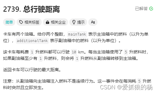 这篇文章介绍了一个名为Solution的类中的distanceTraveled函数,该函数模拟了两个坦克的移动过程,主要通过while循环和条件判断来计算mainTank在给定条件下能行驶的距离。