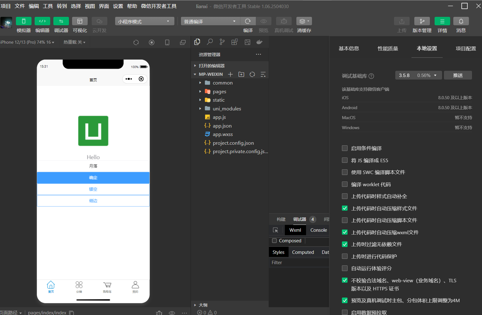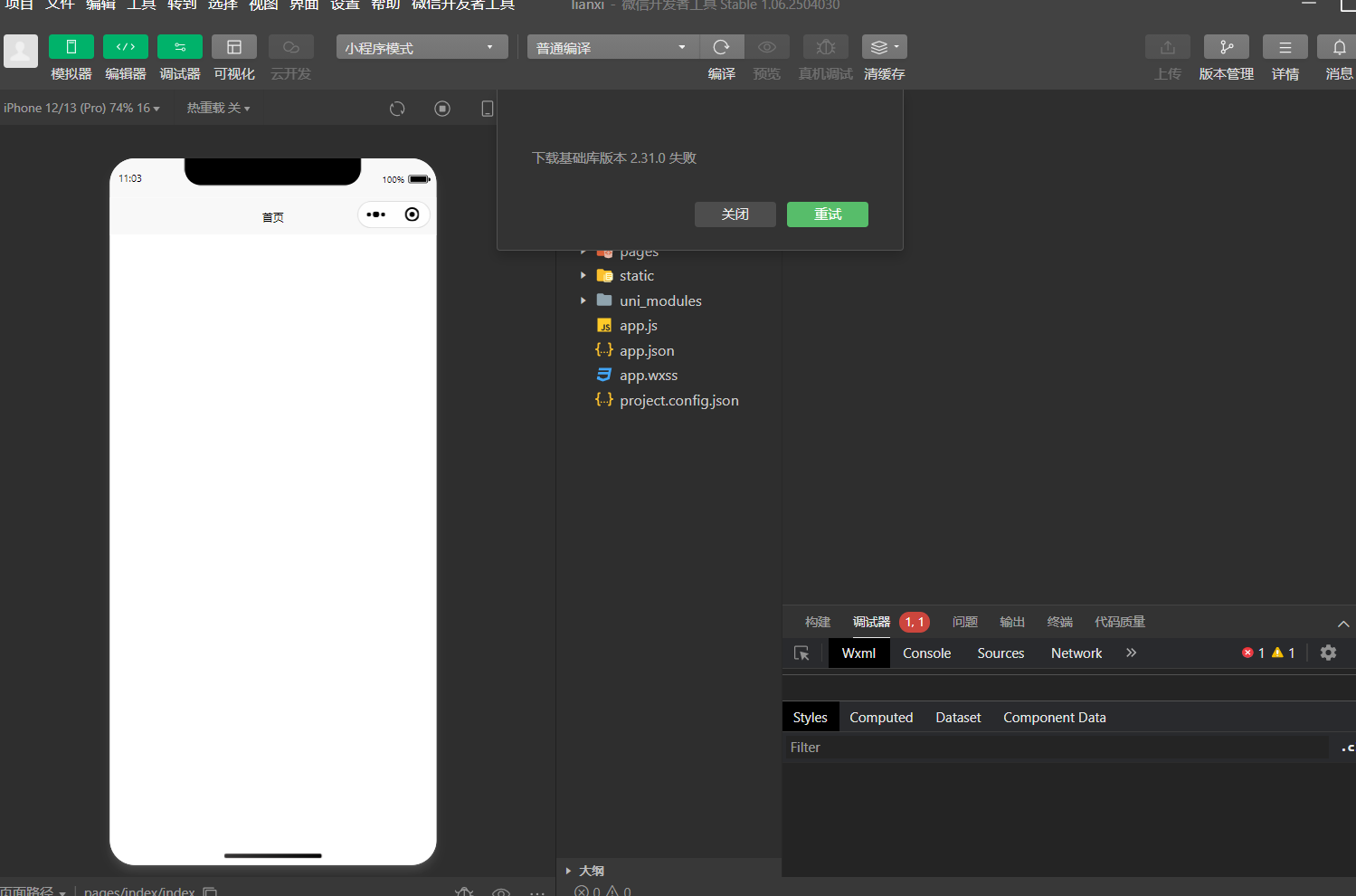 用uni-app工具写的代码,用微信小程序运行时,中间部分不显示。出现 “下载基础库版本 2.31.0 失败”