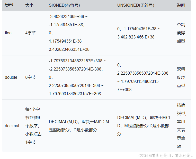 float 为单精度浮点类型,存储空间 4 个字节,支使用标准的浮点运算进行近似计算,若想知道浮点运算是怎么计算的,则需要研究操作系统的浮点数方式,通常对小数精度要求不那么高的字段可使用 float 类型。