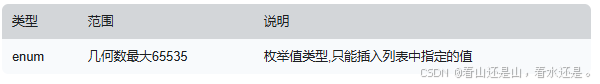 enum 类型为枚举值类型,有时可以使用枚举值替代字符串,枚举列可以把一些不重复的字符串存储为一个预定义的集合。 MySQL 在存储枚举时非常紧凑,会根据列表值的数量压缩到 1 ~ 2 个字节,例如 ENUM (‘黄色’,‘黑色’,‘蓝色’,‘紫色’),枚举值类型字段的需求也可以使用 tinyint 类型来替代。