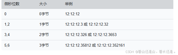 MySQL 数值类型大小和取值范围,实际应用中要根据字段在业务中实际表示的含义来选择数值字段数据类型,例如年龄字段 age 选择无符号 TINYINT 类型,金额数值对精度要求比较高,所以选择 DECIMAL 类型比较合适,时间戳类型使用 INT,对于数据量比较大的表的自增主键 id 可选择 BIGINT,具体字段类型的选择,还需要根据实际情况来综合分析,合理选择即可,字段的默认值尽量避免 NULL。MySQL 日期时间类型和字符串类型,需要注意的是时间类型 TIME、DATETIME、TIMESTAMP 存储大小具体取决于微秒值,例如 TIME 类型,当微秒不存在的时候如 “12:12:12” 字节数为 3 字节(微秒 0 字节)"12:12:12.72"表示微秒 2 位,总共4字节(微秒1字节),“12:12:12.6173” 表示微秒 4 位,总共 5 字节(微秒2字节),“12:12:12.627127” 表示微秒 6 位,总共 6 字节,微秒字节位数对表如下: