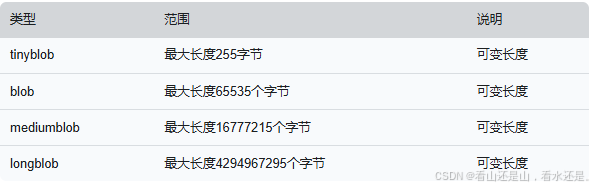 blob 数据类型家族包括 :tinybob、blob、mediumblob、longblob。和 text 家族一样,MySQL 把每个 text 值当做一个独立的对象处理。若 blob 家族的值太大时,InnoDB 存储引擎会额外使用存储区域来进行存储,blob 类型存储的是二进制数据,没有排序规则或字符集。