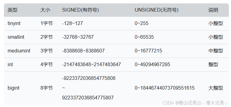 mediumint 为中整数类型,存储空间3个字节(24位),有符号范围 -8388608 ~ 8388607,符号范围 0 ~ 16777215,当遇到最大值不超过 16777215 的整数类型字段时,可使用无符号 mediumint 类型。