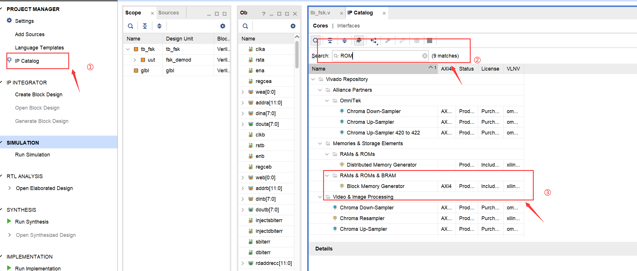 打开vivodo软件之后,首先创建信号源的IP核,如下图找到IP,catalog,点击他右边会弹出页面,搜索ROM,选择BLOCK&ROMs&BRAM,双击他。