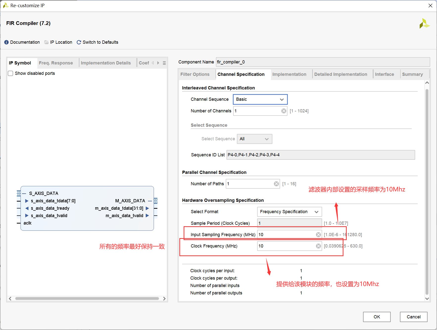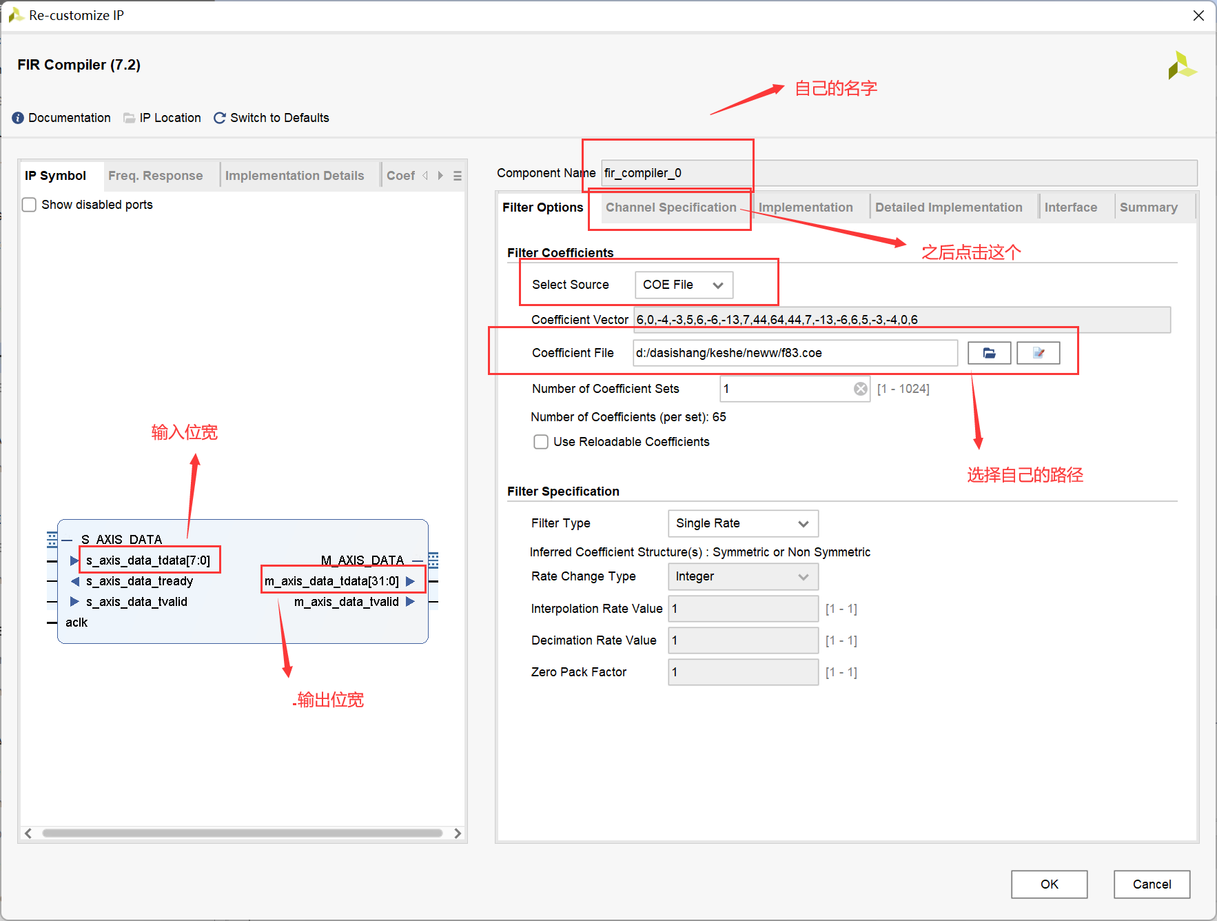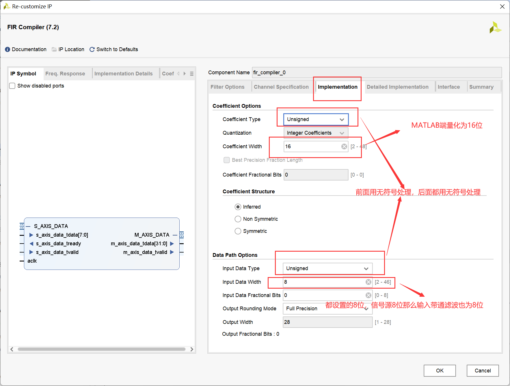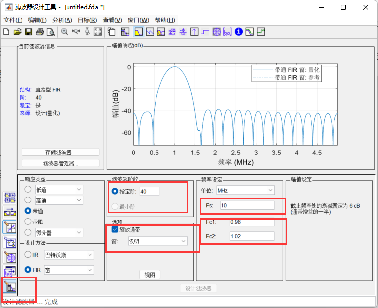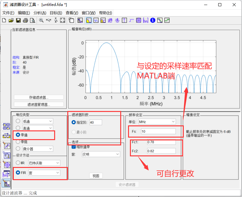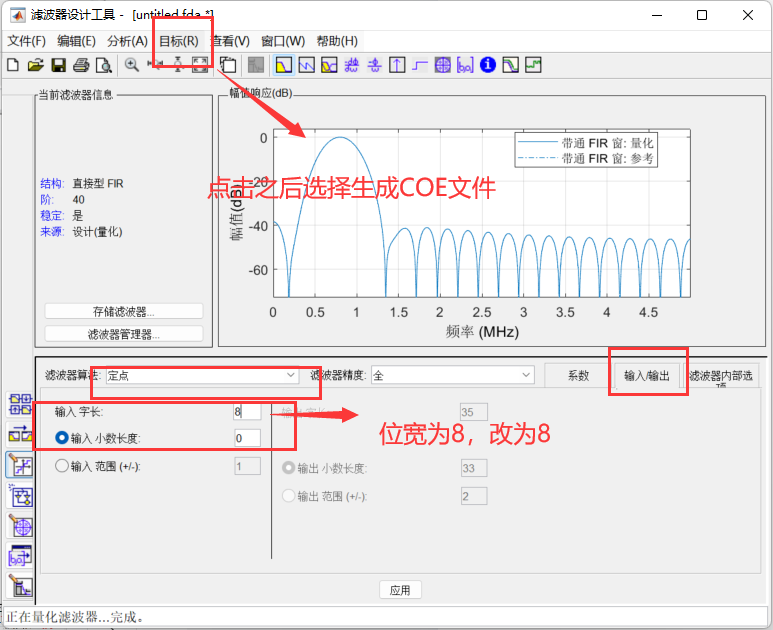 这一部分就稍微讲简单一点,我们输入的位宽同样是8位,频率为10Mhz,所以对比于800Khz的滤波器只需要更改matlab端,在新生成一个IP核那里更改coe的地址既可以,其他参数按照800Khz保持不变