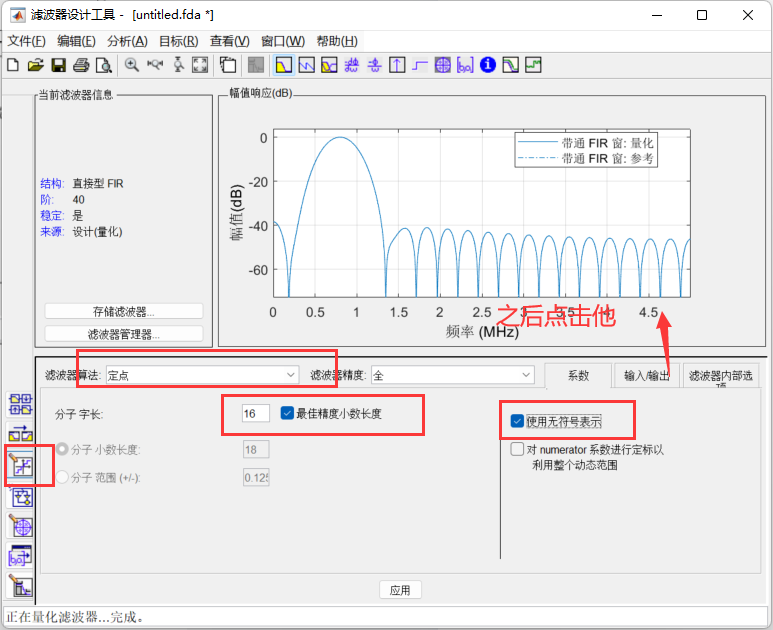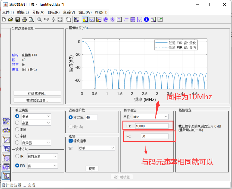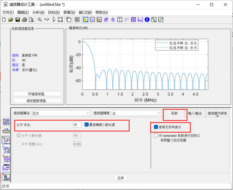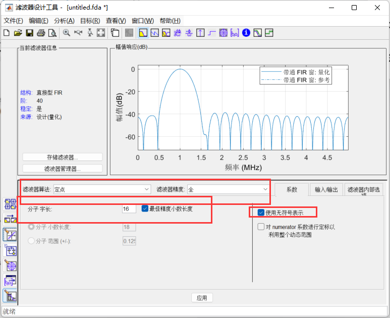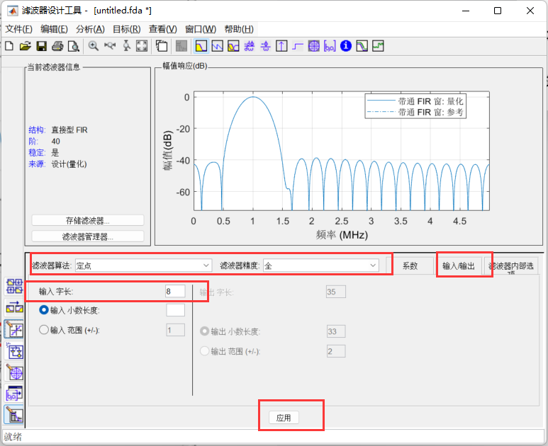 在matlab命令行中输入fdatool,具体选择如下图所示,其中采样频率为10Mhz,选择40阶的滤波器,其中要对量化的位宽以及输入的信号做出限制,都如下图所示: