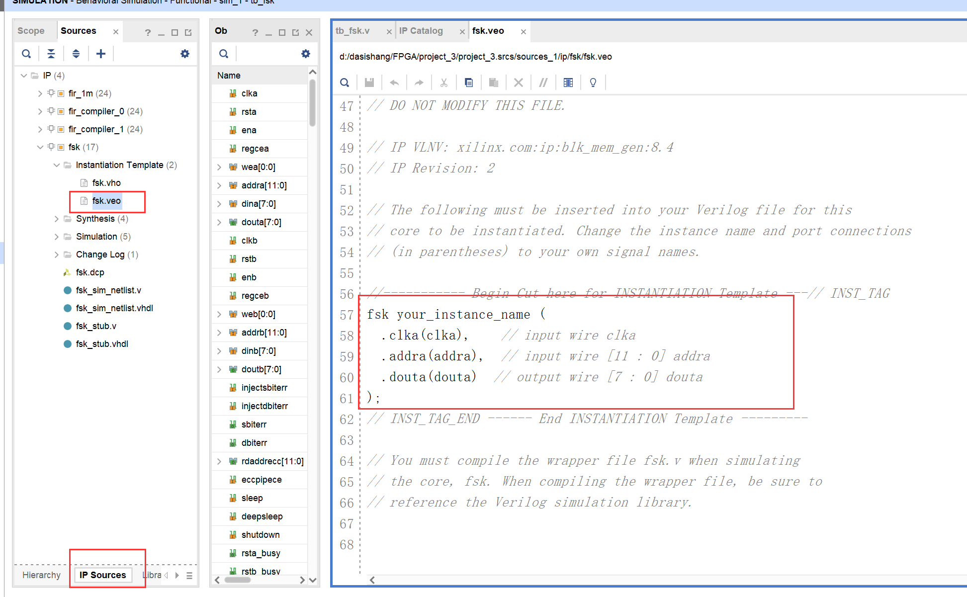 导入到IP核之后,需要进行实例化,才可以调用,相当于一个函数,生成右面的IP核之后找到veo文件,将这个复制到顶层模块可以进行实例化。