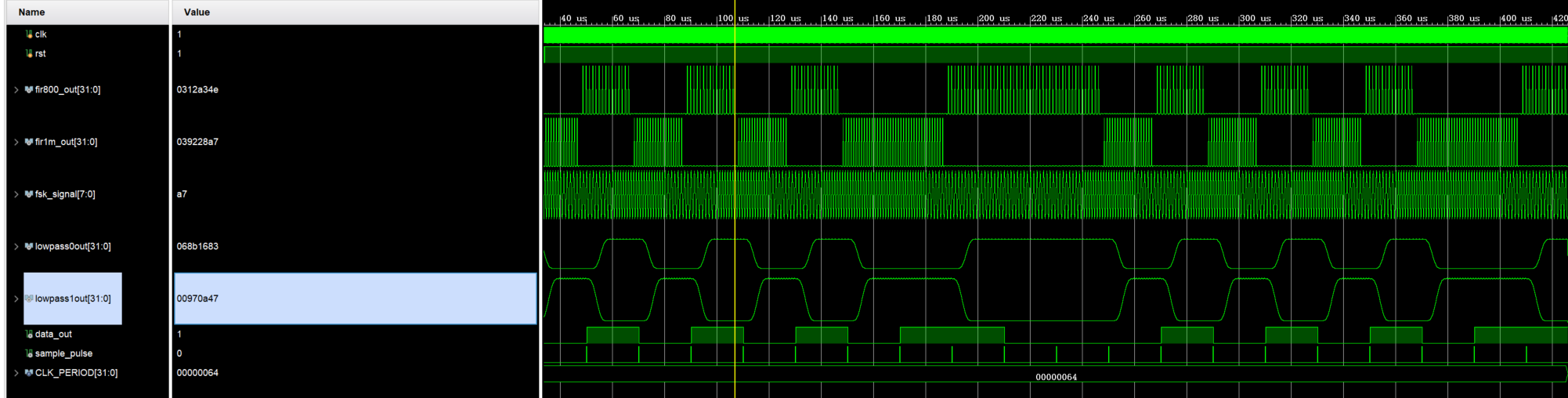 $monitor("Time: %0t ns | rst: %b | FSK: %0d | 800k: %0d | 1M: %0d | LP0: %0d | LP1: %0d | Decision: %b | Sample: %b",