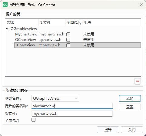 除了代码的声明,还需要去ui界面选择图表的控件。选择Graphics View,拖到ui界面上,将类提升成Mychartview,这个类应该是可以自己取的,提升之后,需要新建一个类Mychartview加入到工程当中。