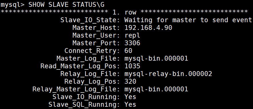 CHANGE MASTER TO MASTER_HOST='192.168.4.90', -- 对端服务器IP MASTER_USER='repl', -- 复制用户名 MASTER_PASSWORD='密码', -- 复制密码 MASTER_LOG_FILE='mysql-bin.000001', -- 对端binlog文件名 MASTER_LOG_POS=1035; -- 对端binlog位置