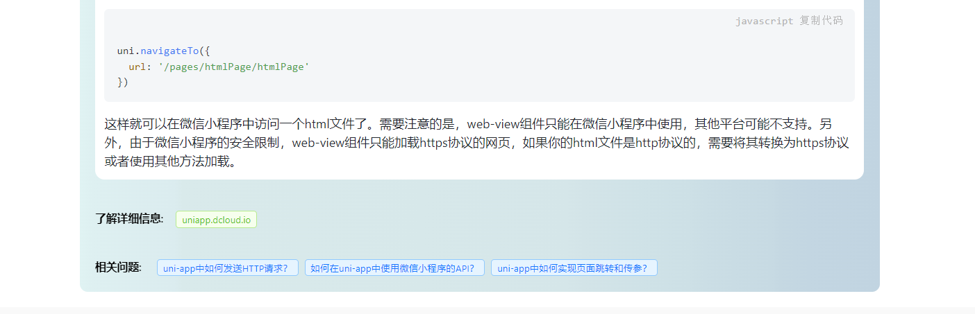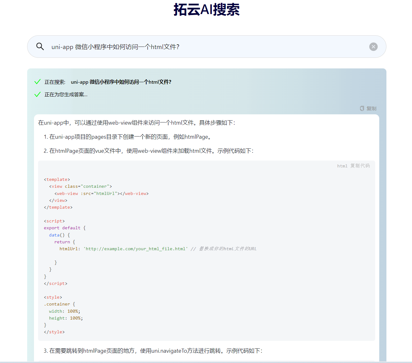本文介绍了在uni-app中通过web-view组件在微信小程序访问html文件的方法,包括创建新页面、插入组件代码及跳转操作。同时讨论了不同平台的支持情况和微信小程序的安全限制。此外,还分享了寻找开发技术问题答案的各种途径,特别是AI搜索的优势和推荐的搜索工具。