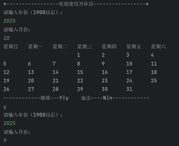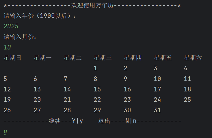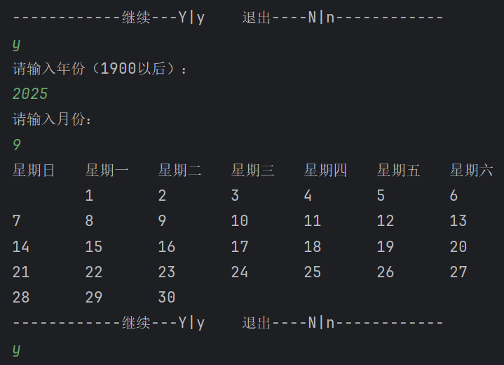 创建一个boolean类型的标识符flag,默认为true(第一次默认出现是否查看),进行查看,并在输出当月的日历后,让用户做出判断,y继续,flag仍然为true,否则flag为false,跳出循环,程序结束