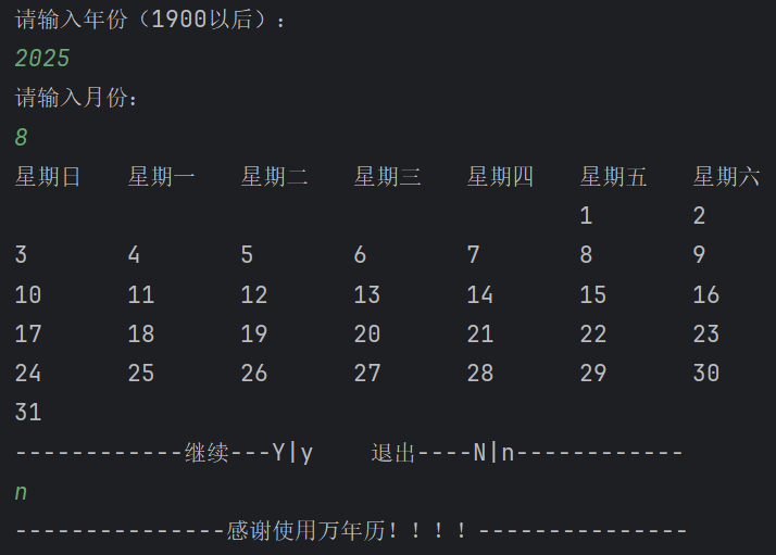 System.out.println("---------------感谢使用万年历!!!!---------------");