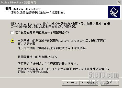 并不是域内的最后一个域控制器,因此我们不能勾选“这个服务器是域中的最后一个域控制器”。