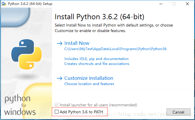 我选择可执行文件方式下载安装了。安装界面还是比较简洁的,安装的时候建议如图标记的Add Python 3.6 to PATH。
