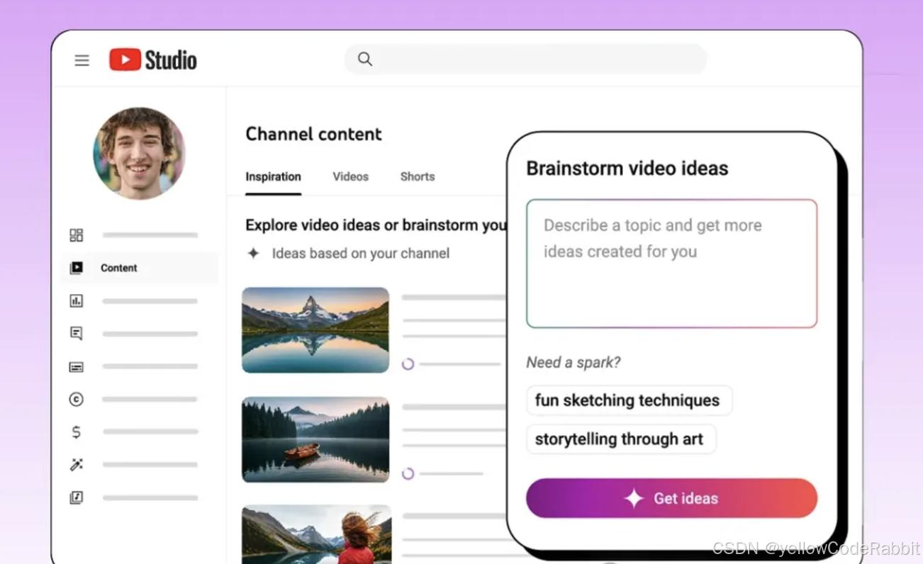 YouTube Studio 中的“灵感”选项卡为创作者提供视频创意、标题、缩略图甚至大纲,充当全面的头脑风暴工具。