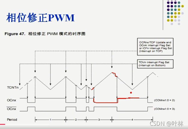 相位修改是如上面,TCNTn不是达到最大值TOP后立刻为0,而是最大值后不断的减-,当减到和比较值后输出再次变换电平,