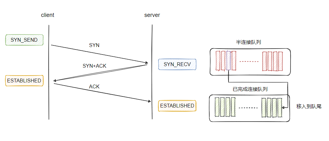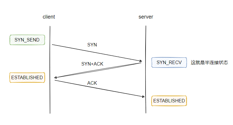 我们都知道 TCP 建立连接需要三次握手,当接收方收到请求方的建连请求后会返回 ack,此时这个连接在接收方就处于半连接状态,当接收方再收到请求方的 ack 时,这个连接就处于已完成状态:
