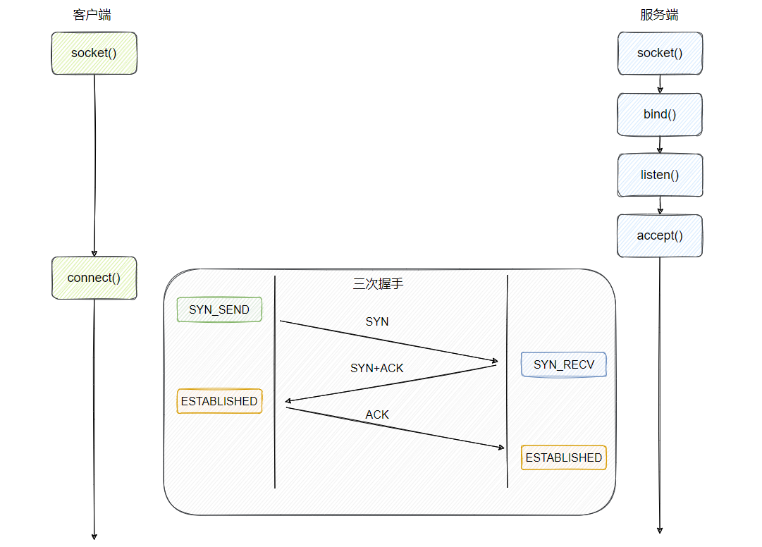 客户端需要与服务端建立连接,在 TCP 协议下开始经典的三次握手操作,再看一下上面画的图: