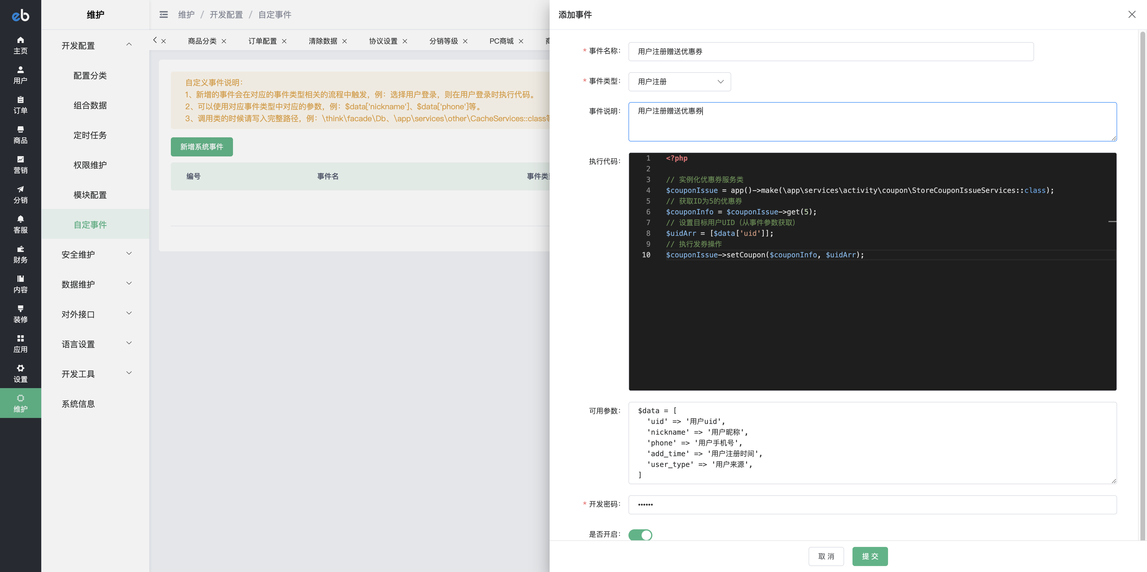 路径:后台 → 系统维护 → 开发配置 → 自定义事件