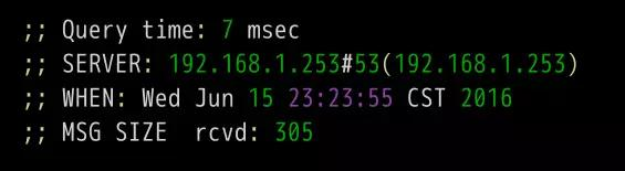 上面结果显示,本机的DNS服务器是192.168.1.253,查询端口是53(DNS服务器的默认端口),以及回应长度是305字节。