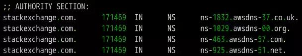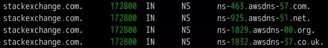 第四段显示stackexchange.com的NS记录(Name Server的缩写),即哪些服务器负责管理stackexchange.com的DNS记录。