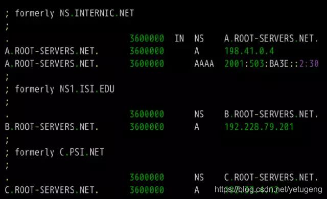 上面列表中,列出了根域名(.root)的三条NS记录A.ROOT-SERVERS.NET、B.ROOT-SERVERS.NET和C.ROOT-SERVERS.NET,以及它们的IP地址(即A记录)198.41.0.4、192.228.79.201、192.33.4.12。