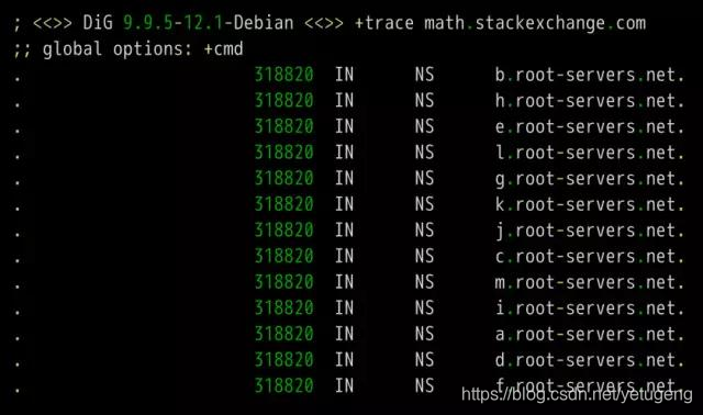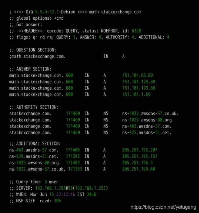 上面结果显示stackexchange.com共有四条NS记录,即四个域名服务器,向其中任一台查询就能知道math.stackexchange.com的IP地址是什么。