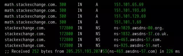上面结果显示,math.stackexchange.com有4条A记录,即这四个IP地址都可以访问到网站。并且还显示,最先返回结果的NS服务器是ns-463.awsdns-57.com,IP地址为205.251.193.207。