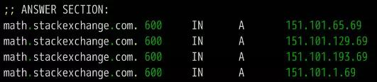 上面结果显示,math.stackexchange.com有四个A记录,即四个IP地址。600是TTL值(Time to live 的缩写),表示缓存时间,即600秒之内不用重新查询。