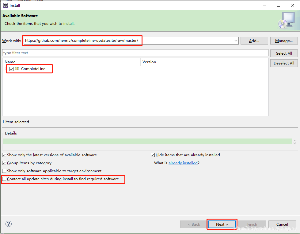 在Work with 处 粘贴插件安装地址并按回车,下方会出现可选的插件名称 CompleteLine,勾选它。