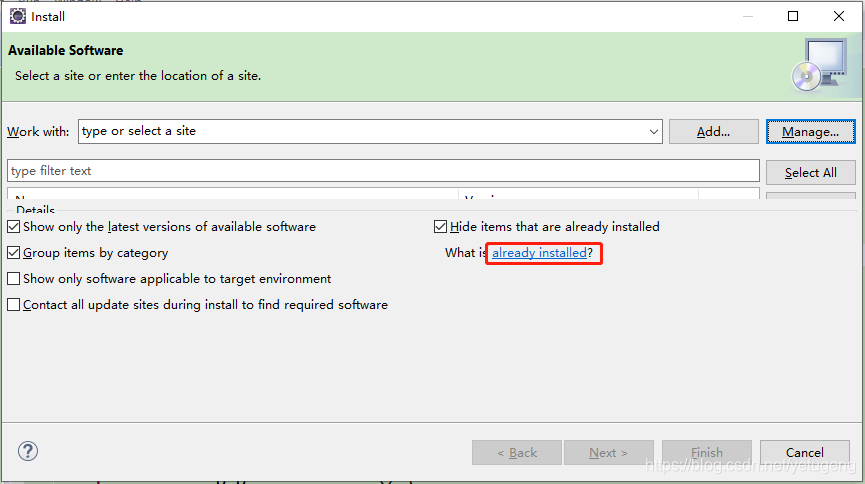 打开eclipse,依次打开 Help->Install New Software,点击 already installed