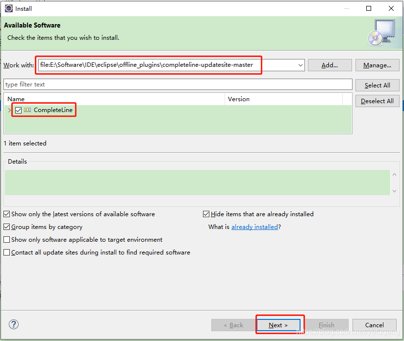 在Work with 处输入 file:E:\Software\IDE\eclipse\offline_plugins\completeline-updatesite-master