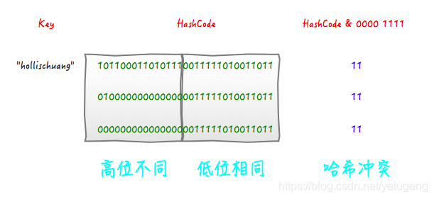 可以看到,后面的两个hashcode经过位运算之后得到的值也是11 ,虽然我们不知道哪个key的hashcode是上面例子中的那两个,但是肯定存在这样的key,这就产生了冲突。