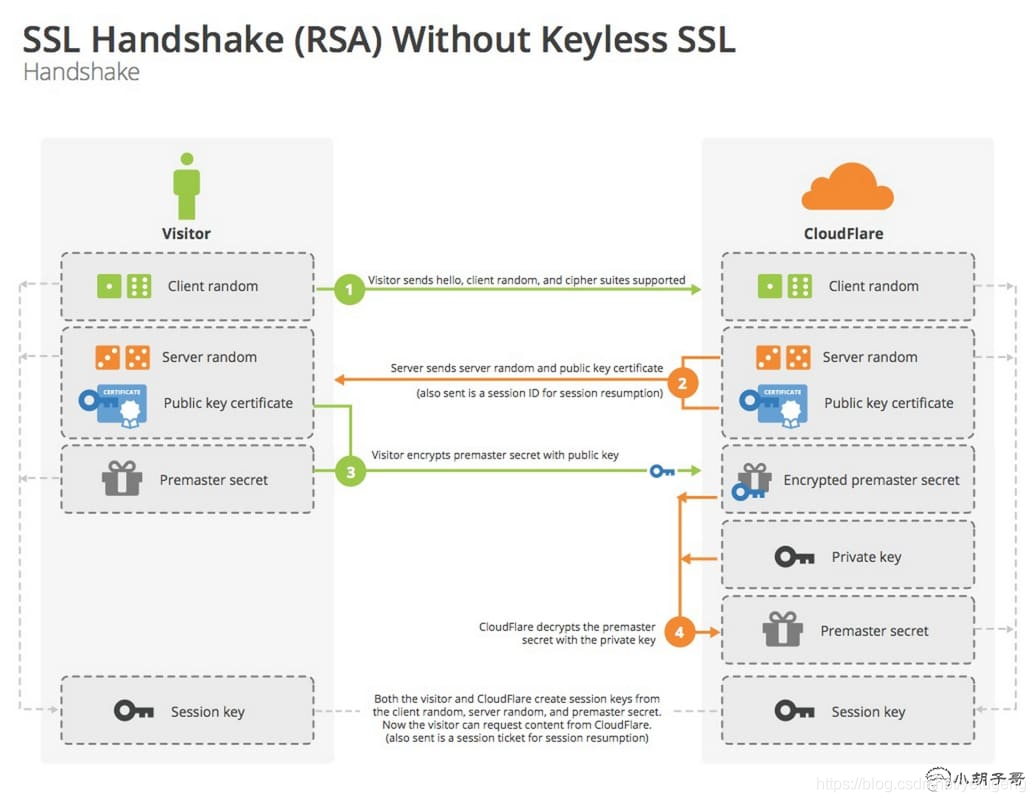 premaster secret(通过random-client、random-server经过一定算法生成的东西),再一次送给服务器端,这次传过去的东西会使用公钥加密 - 服务器端先使用私钥解密,拿到