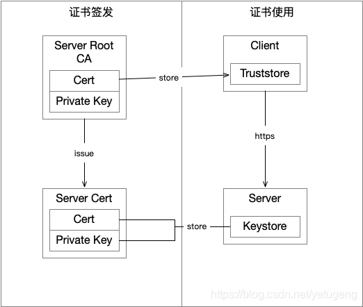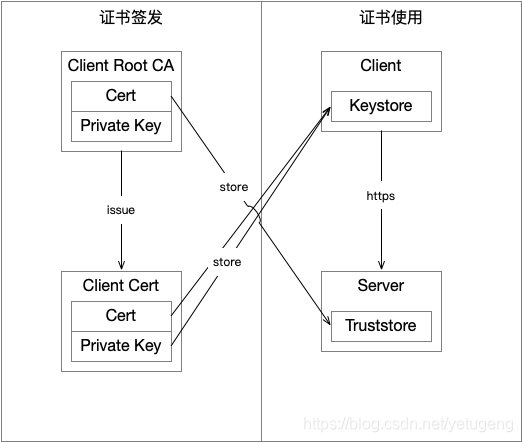 可以看到客户端有一个truststore,这个就是存放信任CA证书的地方,服务端有一个keystore,存放的自己的证书及对应的私钥。