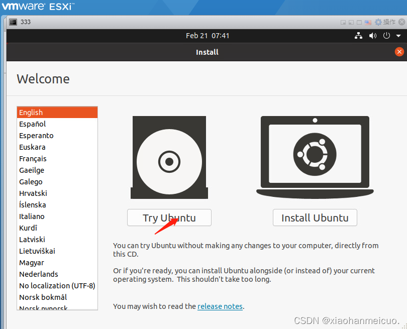 1.在安装的第一个界面选择Try Ubuntu 试用乌班图
