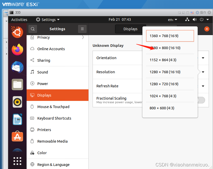 在VmwareWorkstation中,用户可以通过按CTRL+ALT+T调出命令终端,输入xrandr--size1280x800来调整屏幕大小。而在VmwareESXI中,由于命令行方式不适用,可以在安装时选择TryUbuntu试用模式,然后在设置中修改屏幕分辨率以适应安装过程。