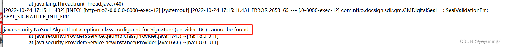 可以看到 整个应用报错,实际是指向 org.bouncycastle.jcajce.provider.asymmetric.rsa.DigestSignatureSpi$SHA256 提示java.security.NoSuchAlgorithmException: 没有这样的加密算法导致的。