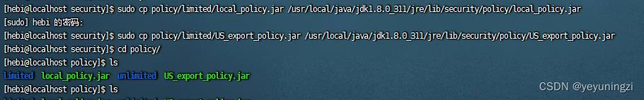 sudo cp policy/limited/US_export_policy.jar /usr/local/java/jdk1.8.0_311/jre/lib/security/policy/US_export_policy.jar #将jre/lib/jre/lib/security/policy/下limited下的jar拷贝到policy文件夹下
