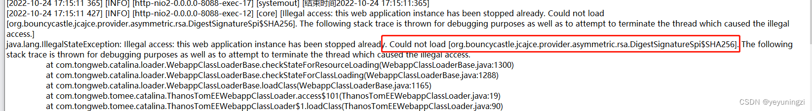 [Illegal access: this web application instance has been stopped already. Could not load [org.bouncycastle.jcajce.provider.asymmetric.rsa.DigestSignatureSpi$SHA256]. The following stack trace is thrown for debugging purposes as well as to attempt to terminate the thread which caused the illegal access.]