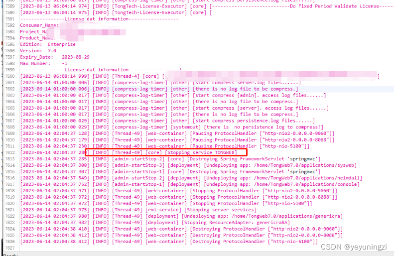 背景:某天同事在某服务器上部署了tongweb并部署应用,结果发现tongweb总是要自己down掉,开始怀疑是服务器内存以及配置的问题,将虚拟机内存8G增加到了32G内存,但是还是说要自己挂掉。怀疑是应用的问题(实际上应用已经在很多服务器上通过Tongweb部署并且正常运行没发现问题),还是让其只运行TongWeb。结果还是发现要挂掉。经过查看Tongweb的日志等发现并没有明显的报错信息。输出信息如下图所示: