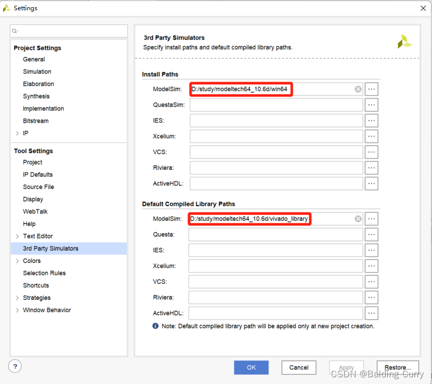 因为新建工程的默认仿真工具是Vivado Simulator,所以要使用Modelsim仿真,每个新工程都要设置一次,方法如下: